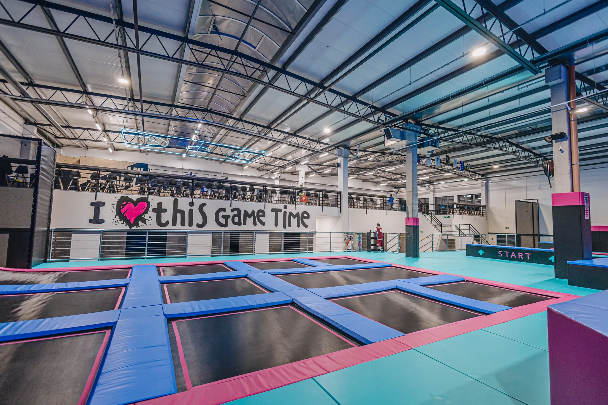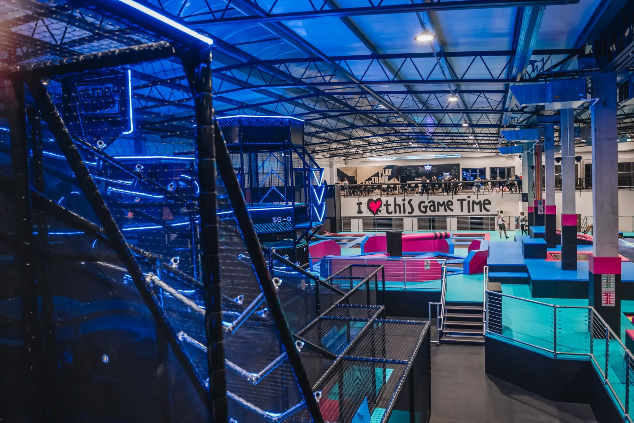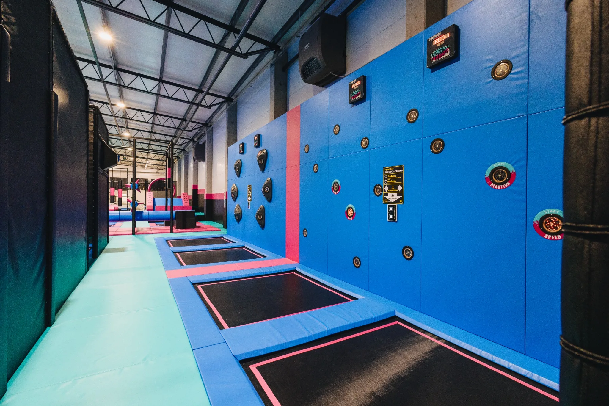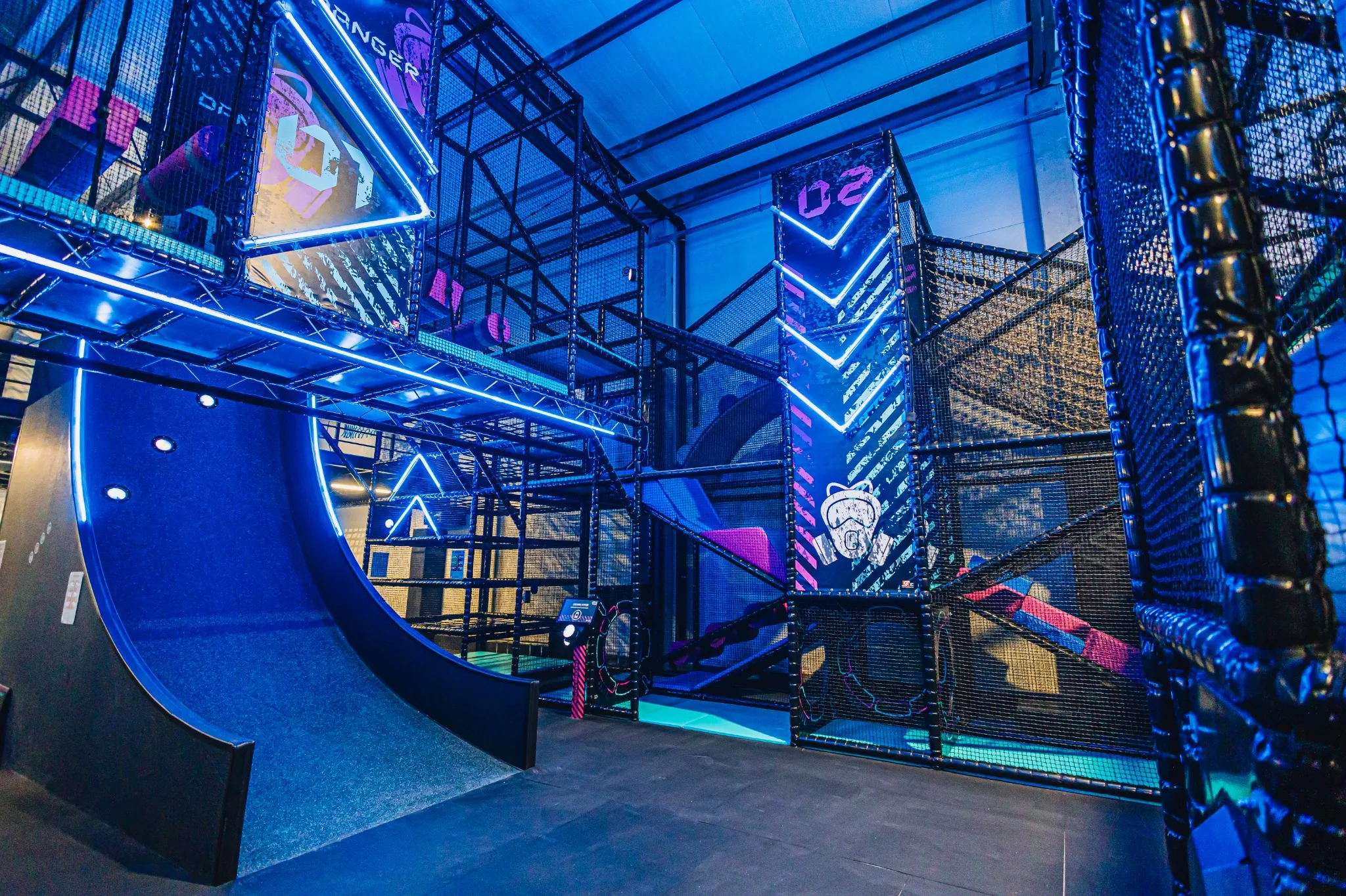 GameTime Gorzów Wielkopolski to ukończony kryty park rozrywki w Polsce, który łączy rozbudowane strefy trampolin, interaktywne ściany do gier, atrakcje przeszkodowe oraz spektakularną wielopoziomową konstrukcję soft play ze zjeżdżalniami i neonowym wykończeniem. Finalna realizacja została zaprojektowana tak, aby zapewnić dynamiczne doświadczenie użytkowników przy jednoczesnym zachowaniu czytelnego podziału pomiędzy atrakcjami rodzinnymi, strefami wyzwań i polami swobodnego skakania.