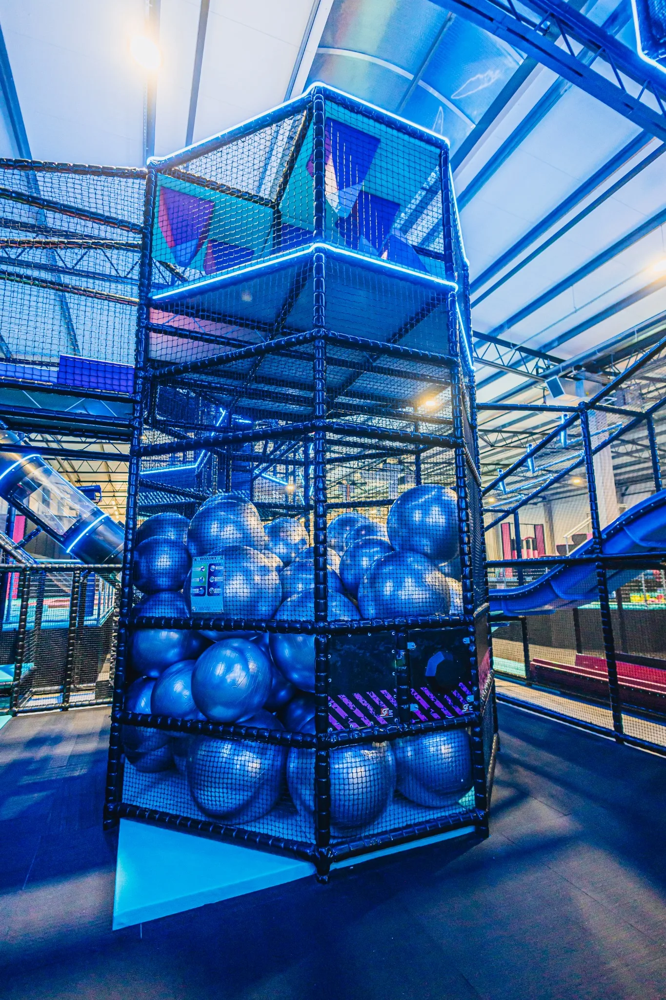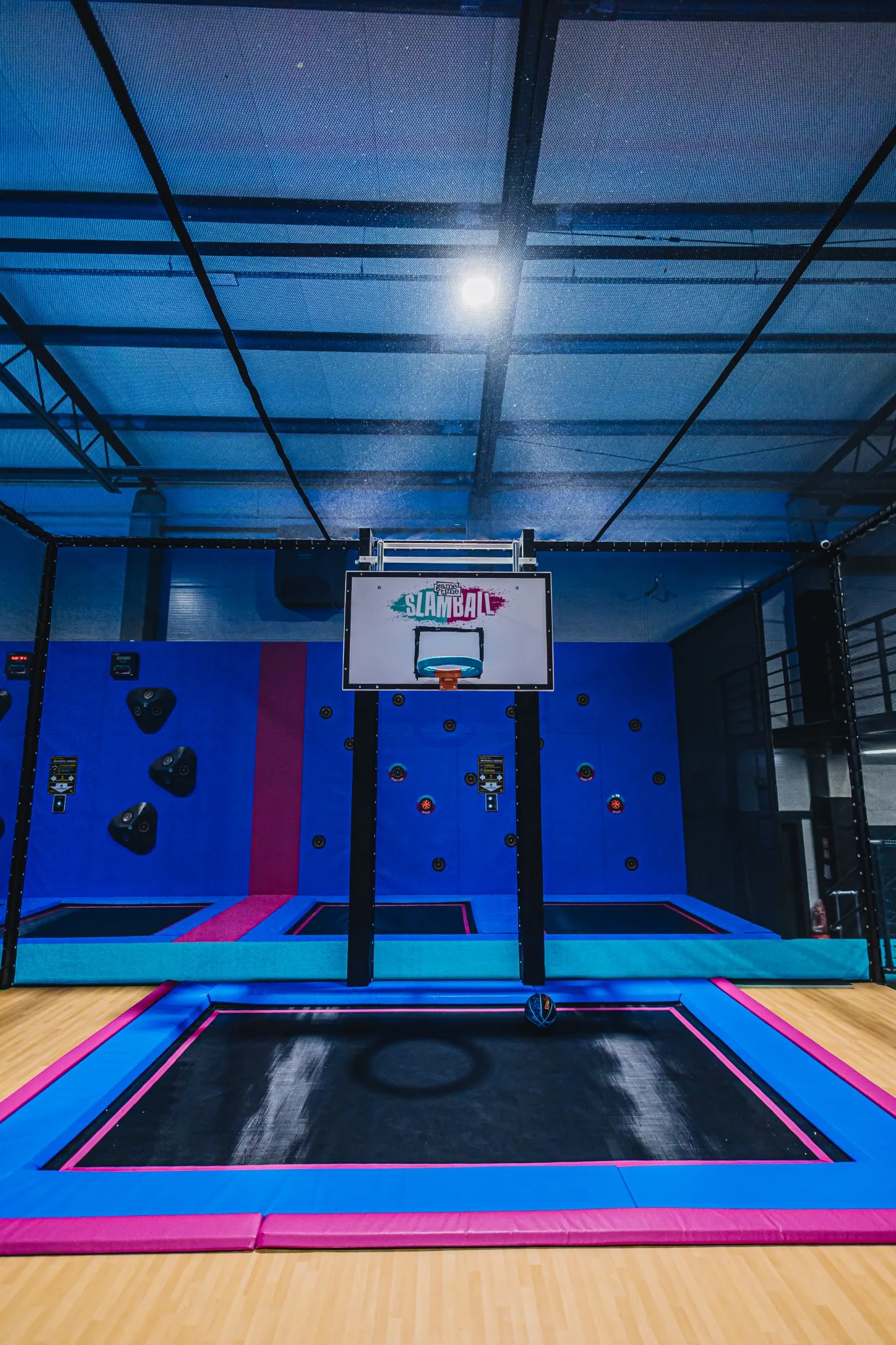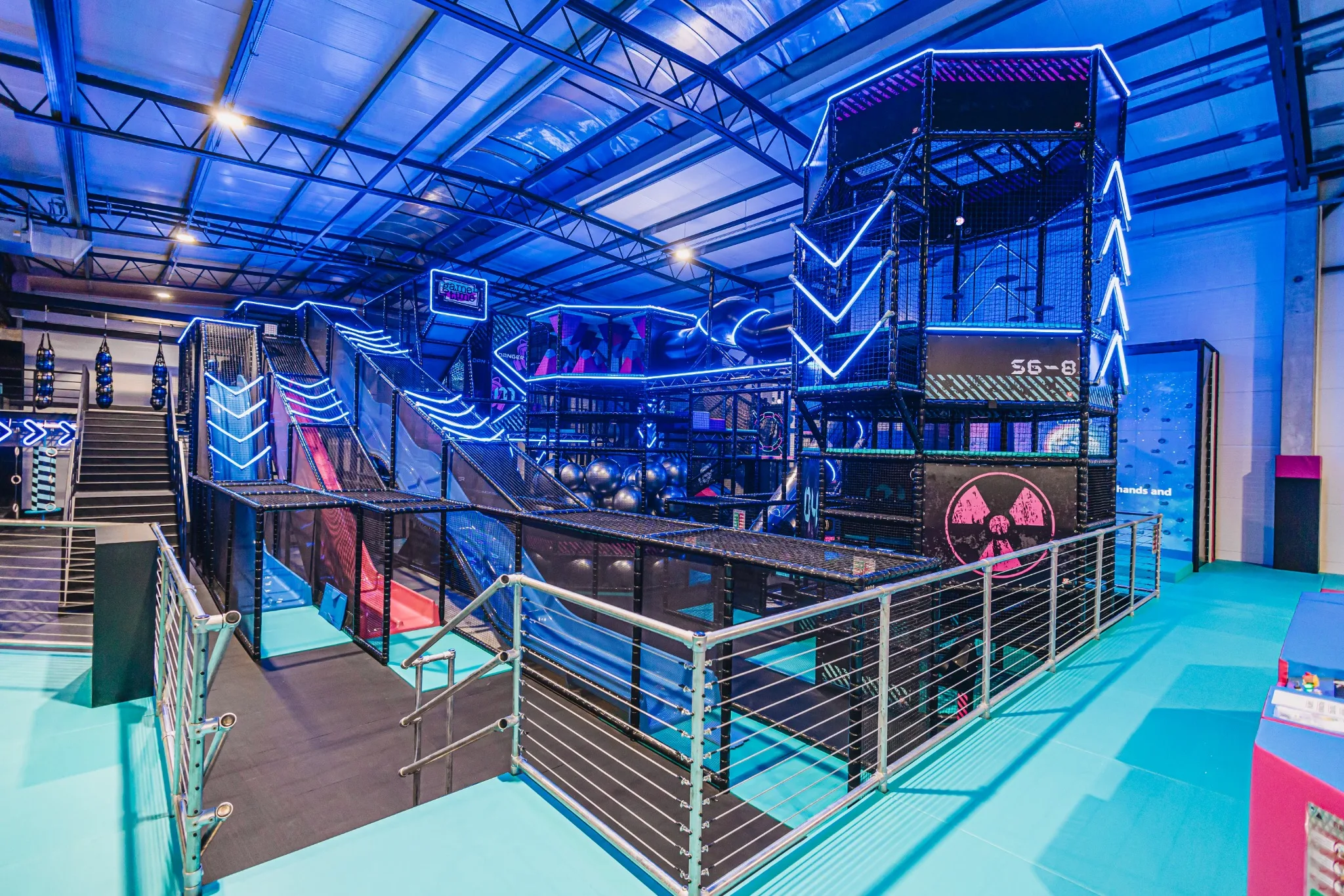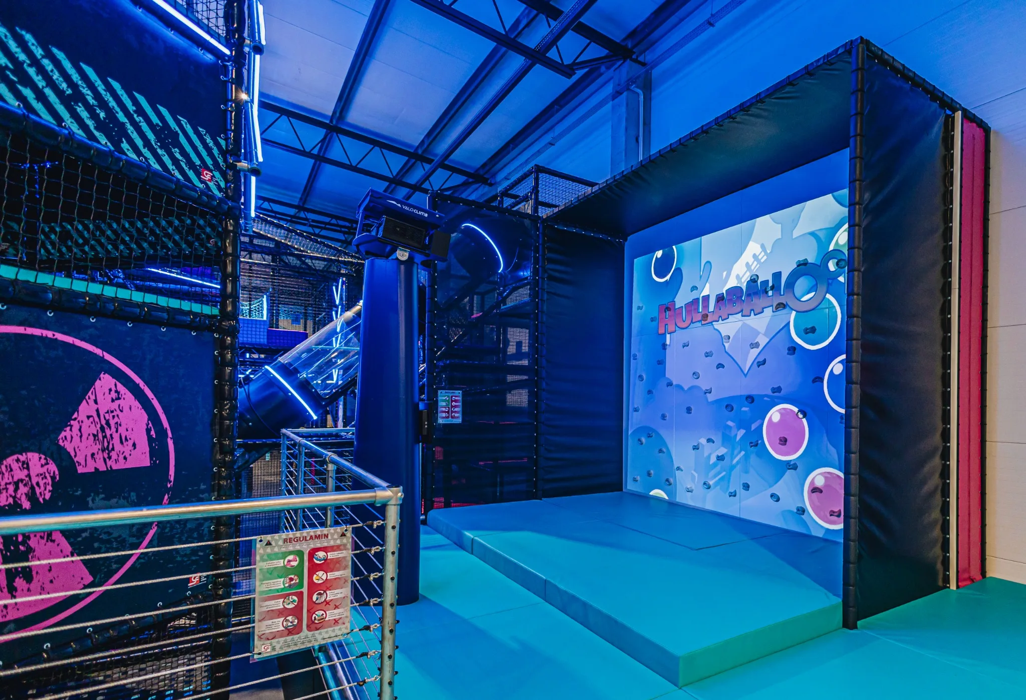 GameTime Gorzów Wielkopolski to ukończony kryty park rozrywki w Polsce, który łączy rozbudowane strefy trampolin, interaktywne ściany do gier, atrakcje przeszkodowe oraz spektakularną wielopoziomową konstrukcję soft play ze zjeżdżalniami i neonowym wykończeniem. Finalna realizacja została zaprojektowana tak, aby zapewnić dynamiczne doświadczenie użytkowników przy jednoczesnym zachowaniu czytelnego podziału pomiędzy atrakcjami rodzinnymi, strefami wyzwań i polami swobodnego skakania.