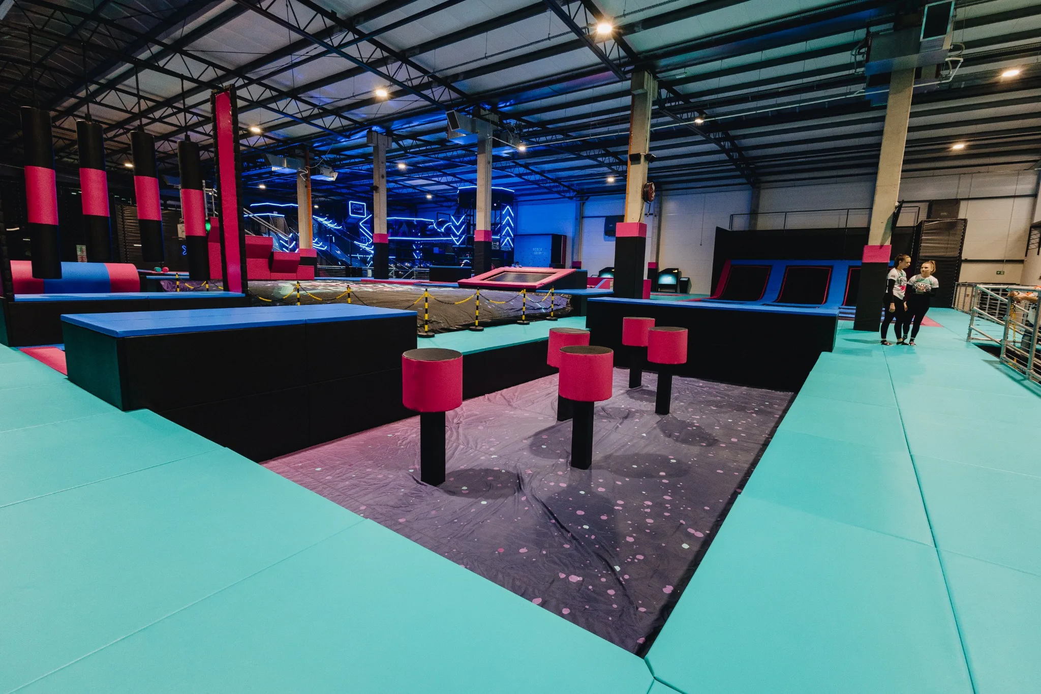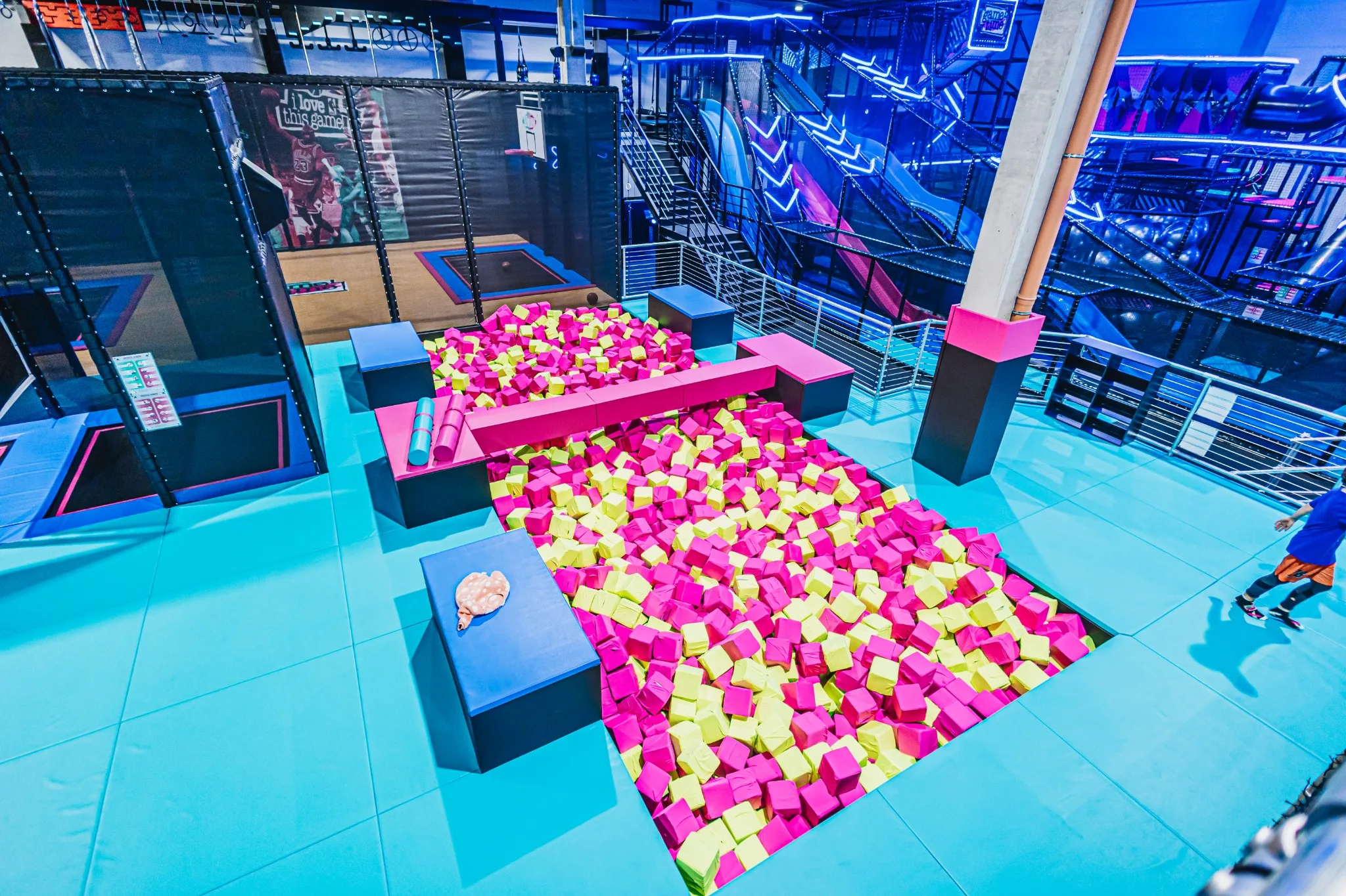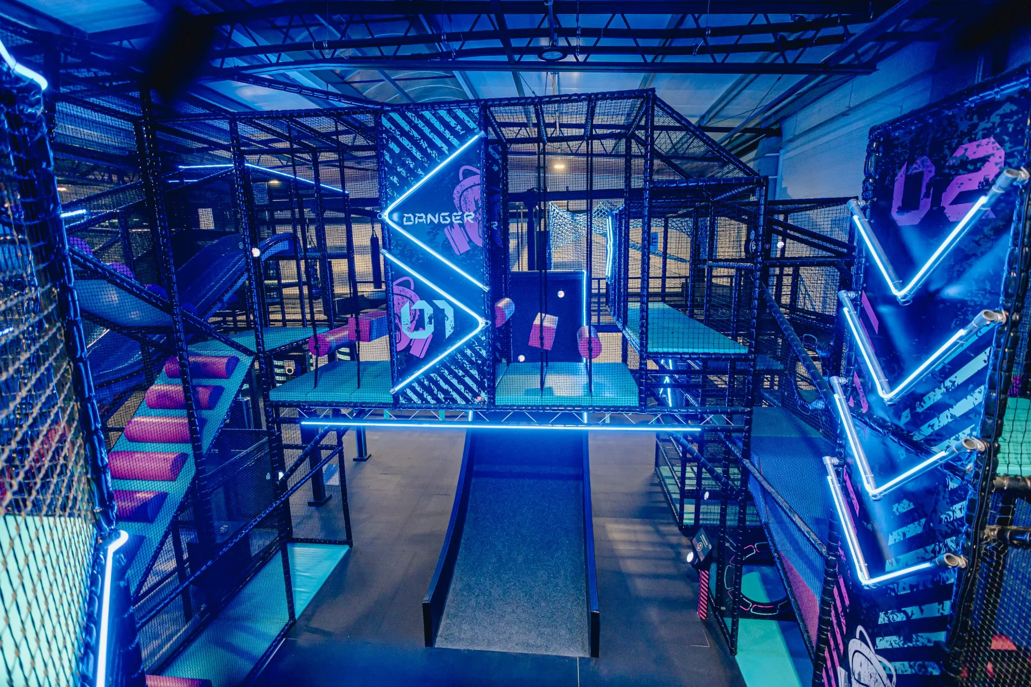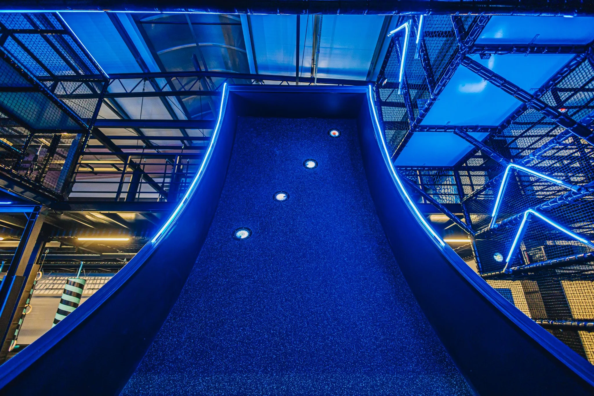 GameTime Gorzów Wielkopolski to ukończony kryty park rozrywki w Polsce, który łączy rozbudowane strefy trampolin, interaktywne ściany do gier, atrakcje przeszkodowe oraz spektakularną wielopoziomową konstrukcję soft play ze zjeżdżalniami i neonowym wykończeniem. Finalna realizacja została zaprojektowana tak, aby zapewnić dynamiczne doświadczenie użytkowników przy jednoczesnym zachowaniu czytelnego podziału pomiędzy atrakcjami rodzinnymi, strefami wyzwań i polami swobodnego skakania.