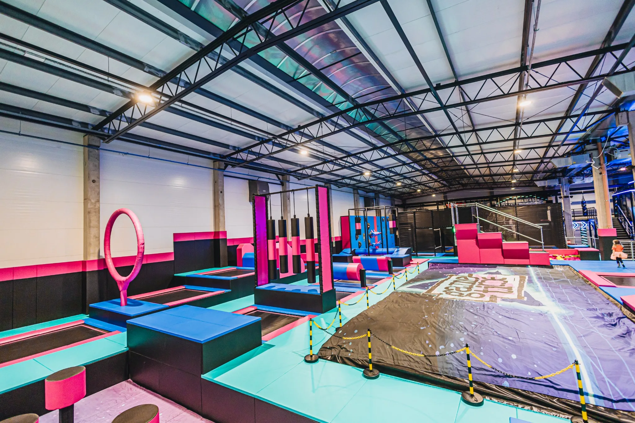 Gotowy obiekt z polami trampolin, atrakcjami przeszkodowymi, interaktywnymi ścianami, strefami z basenem z gąbek, konstrukcją soft play i przestrzeniami aktywności dla rodzin.
