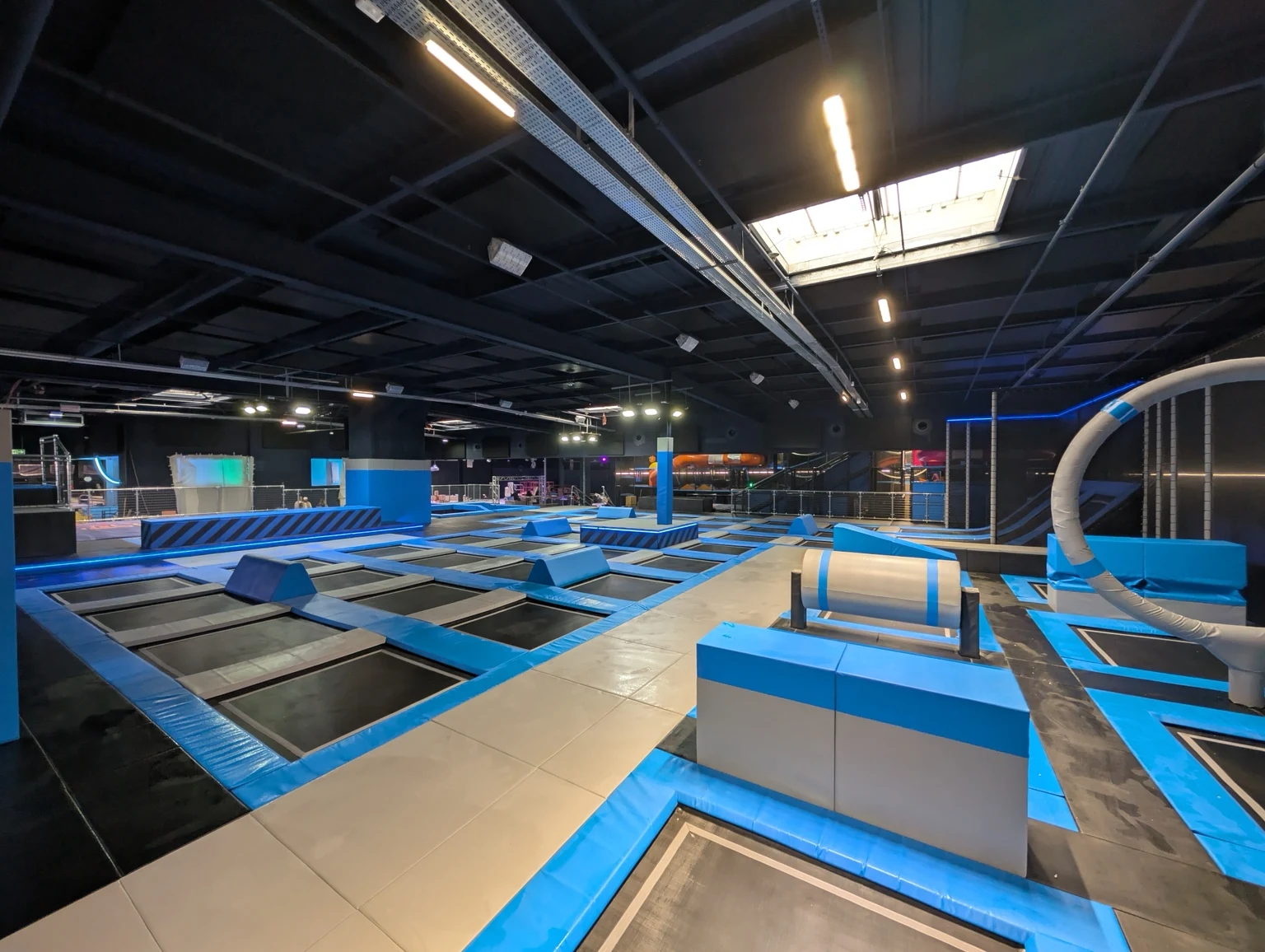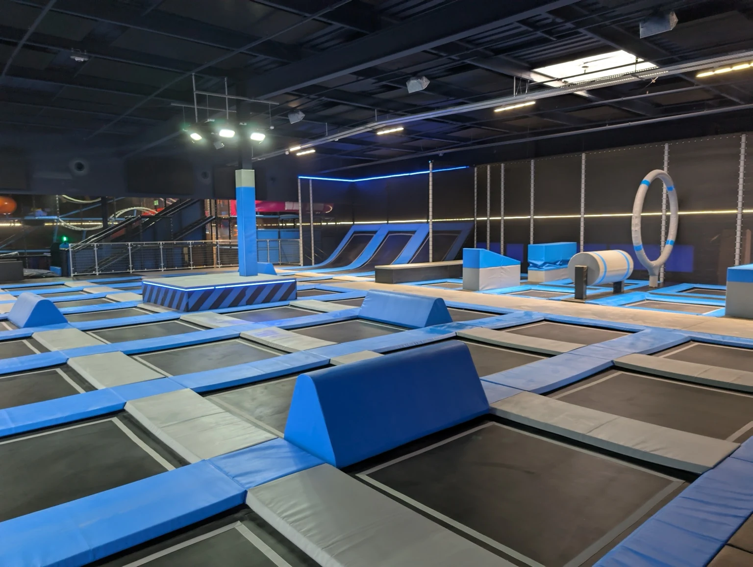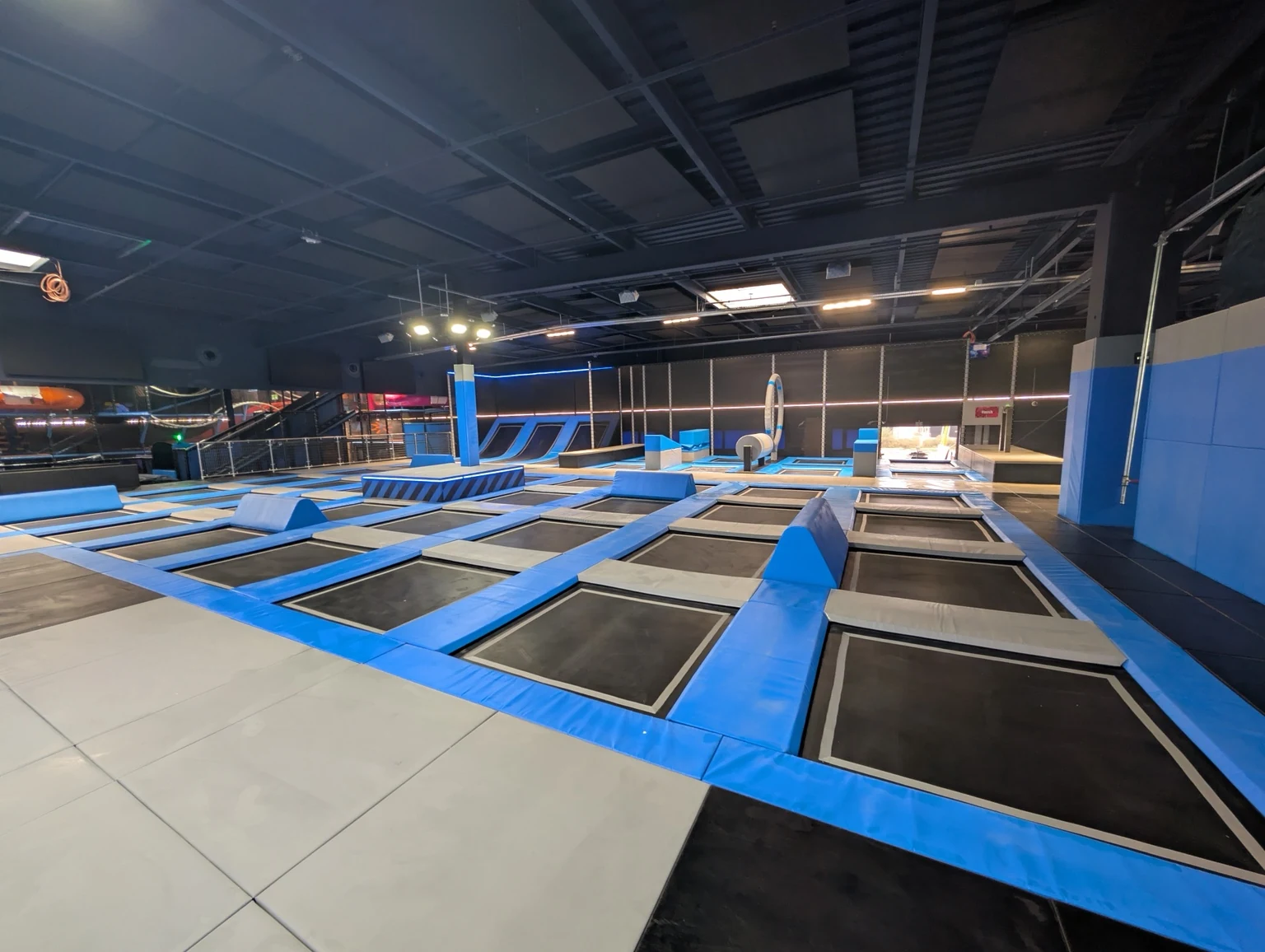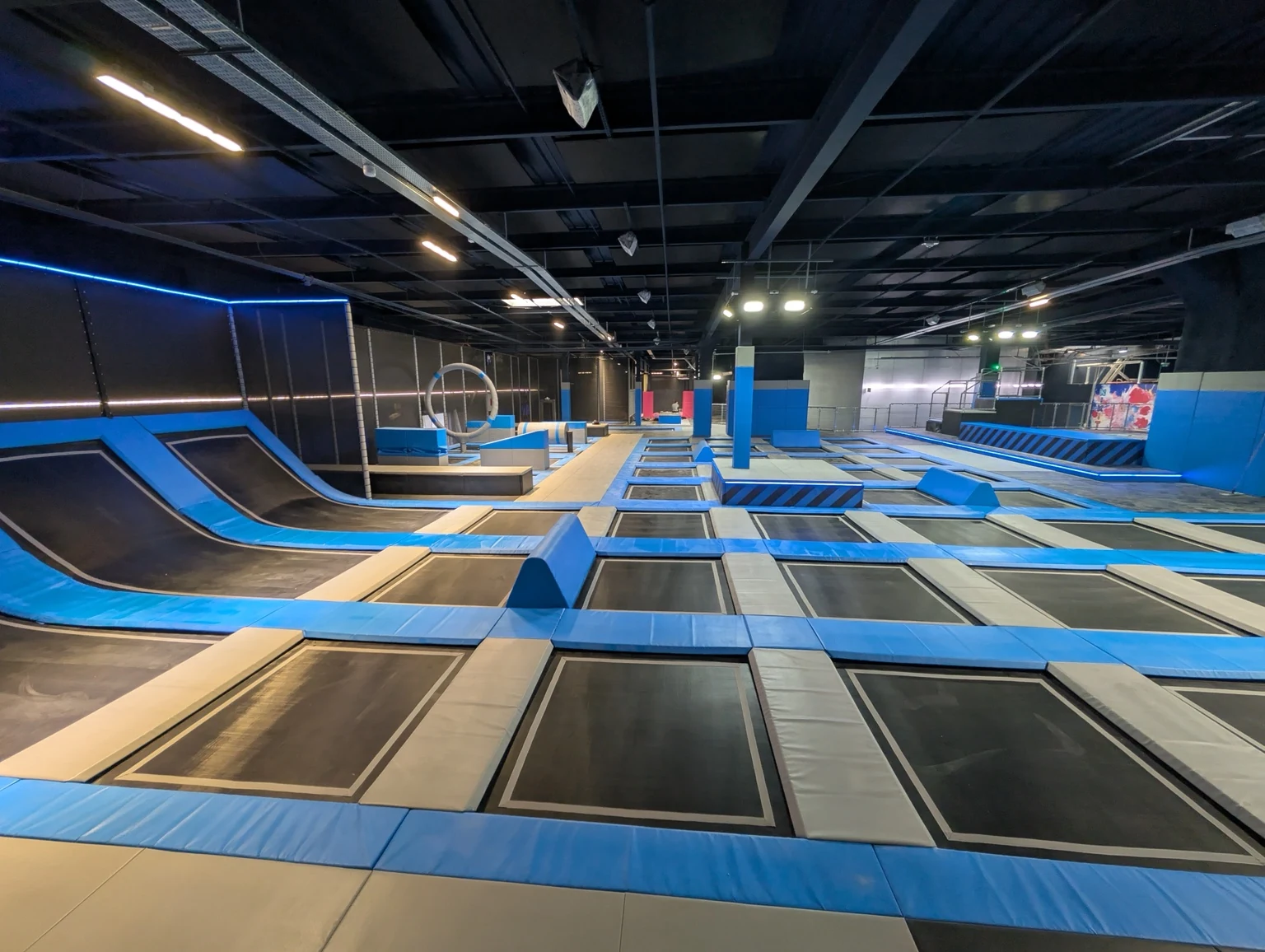 Gotowy obiekt z polami trampolin, skośnymi trampolinami przyściennymi, elementami przeszkodowymi, strefami soft play i atrakcjami dla rodzin.