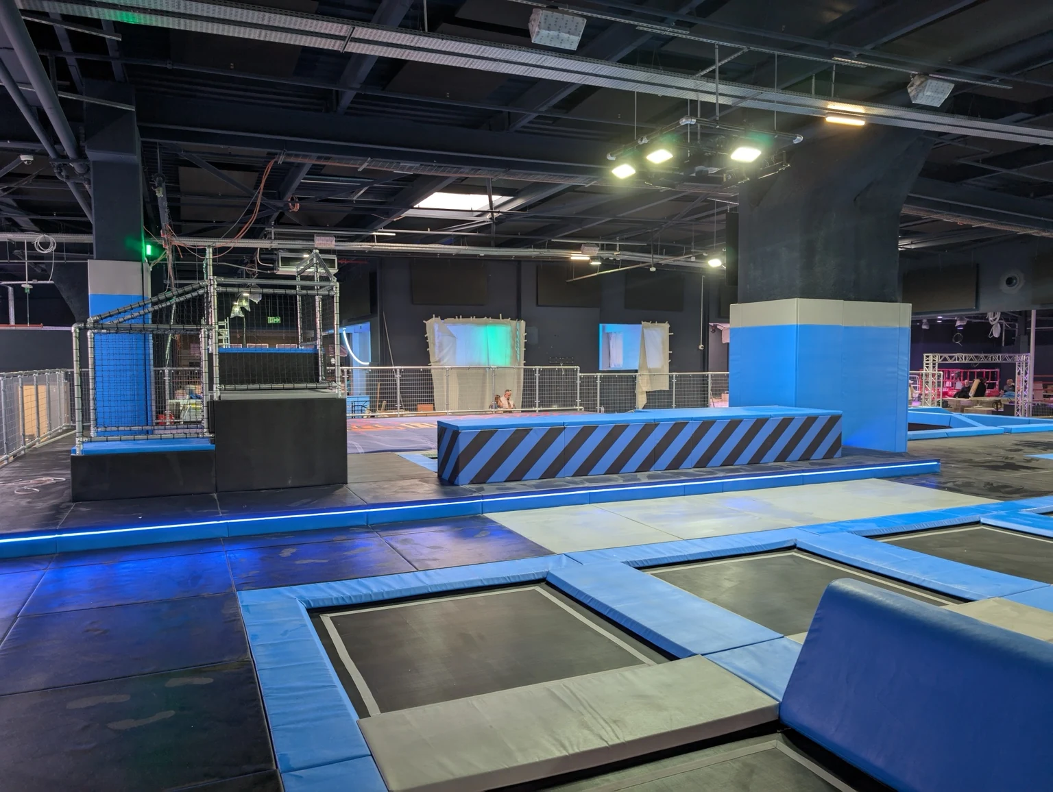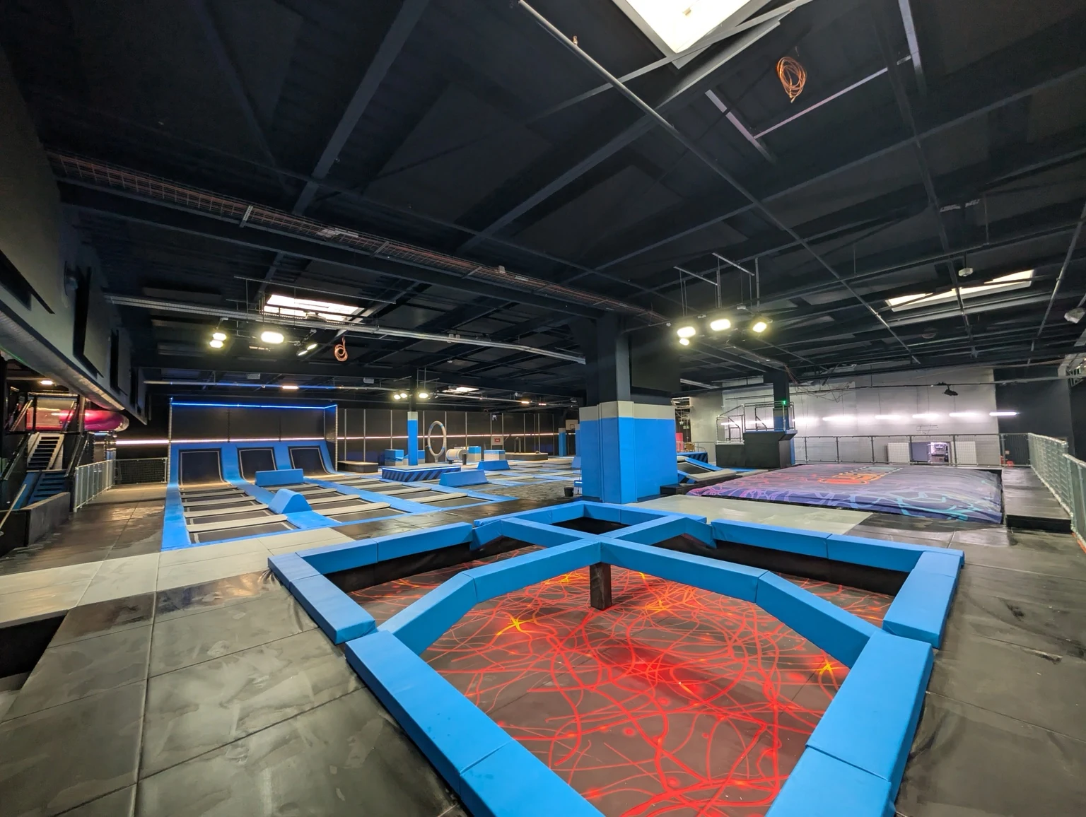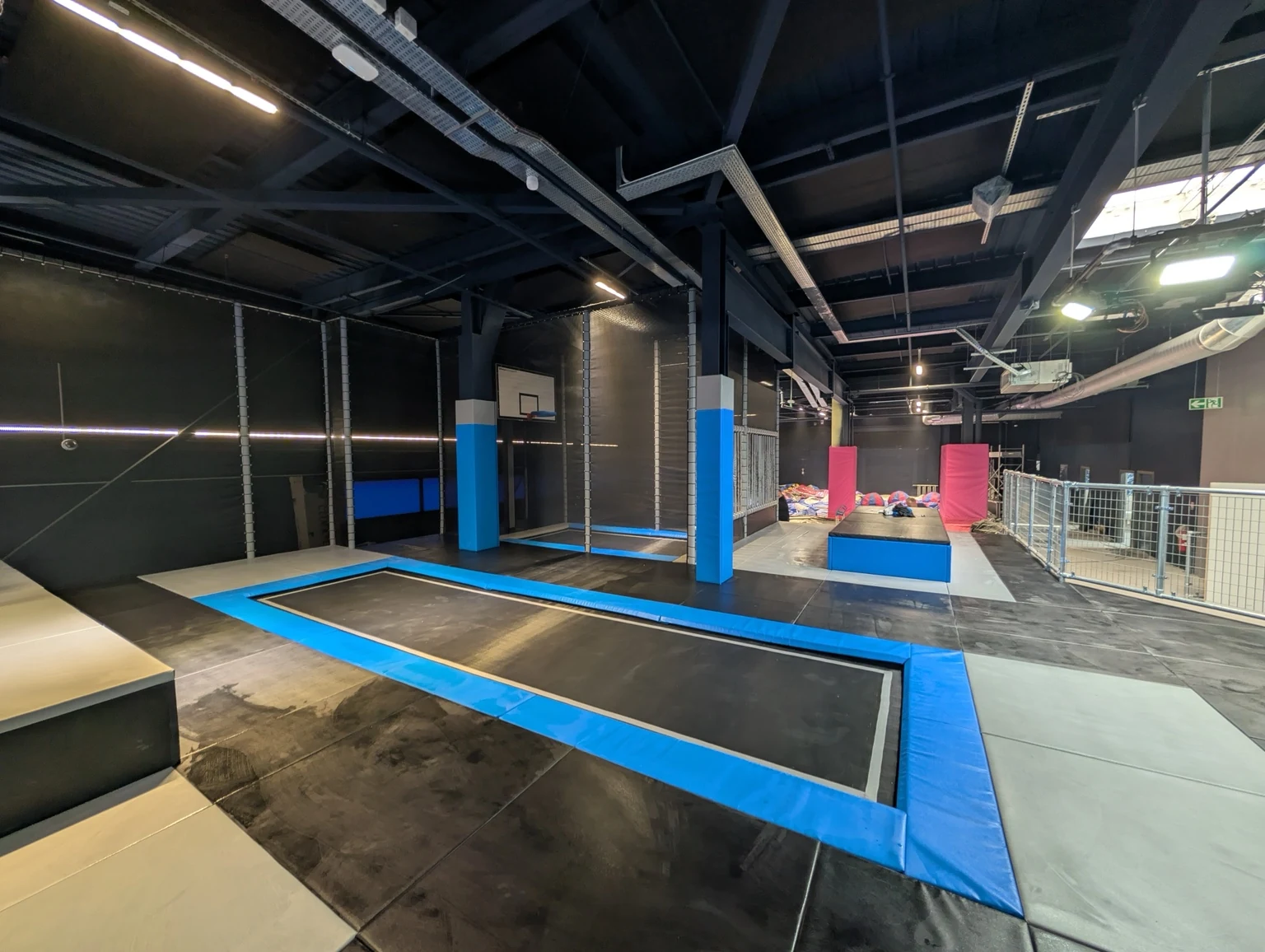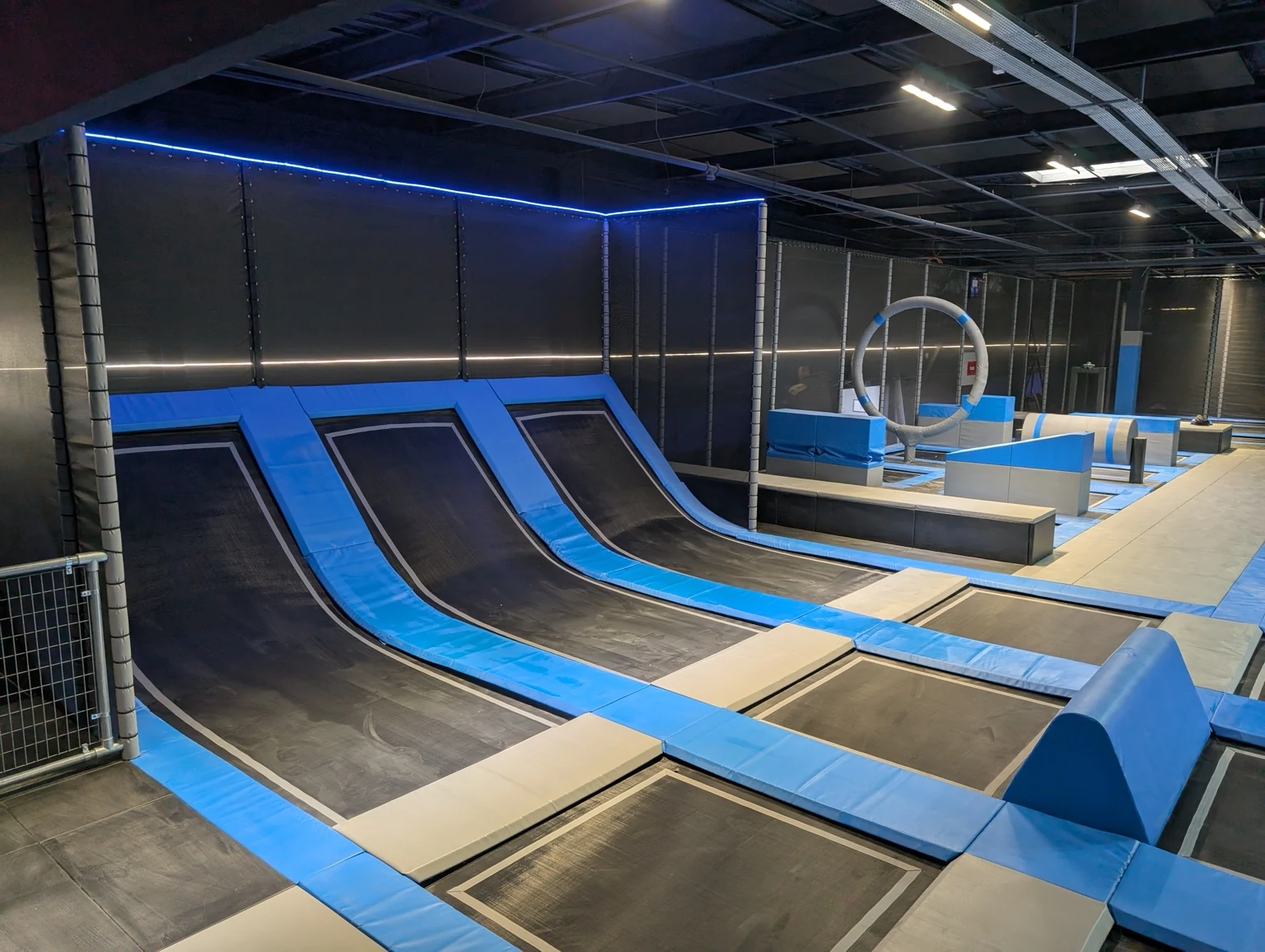 Gotowy obiekt z polami trampolin, skośnymi trampolinami przyściennymi, elementami przeszkodowymi, strefami soft play i atrakcjami dla rodzin.